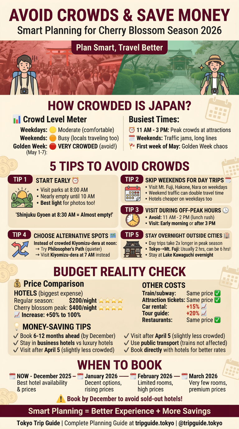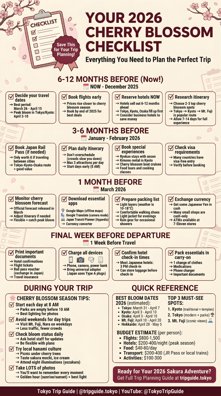 Lock down your hotels immediately. Prime sakura-viewing neighborhoods sell out 6-12 months before peak bloom, we’re talking December 2025 or earlier. Procrastinate until spring 2026? You’ll pay double for rooms an hour away from anywhere good.